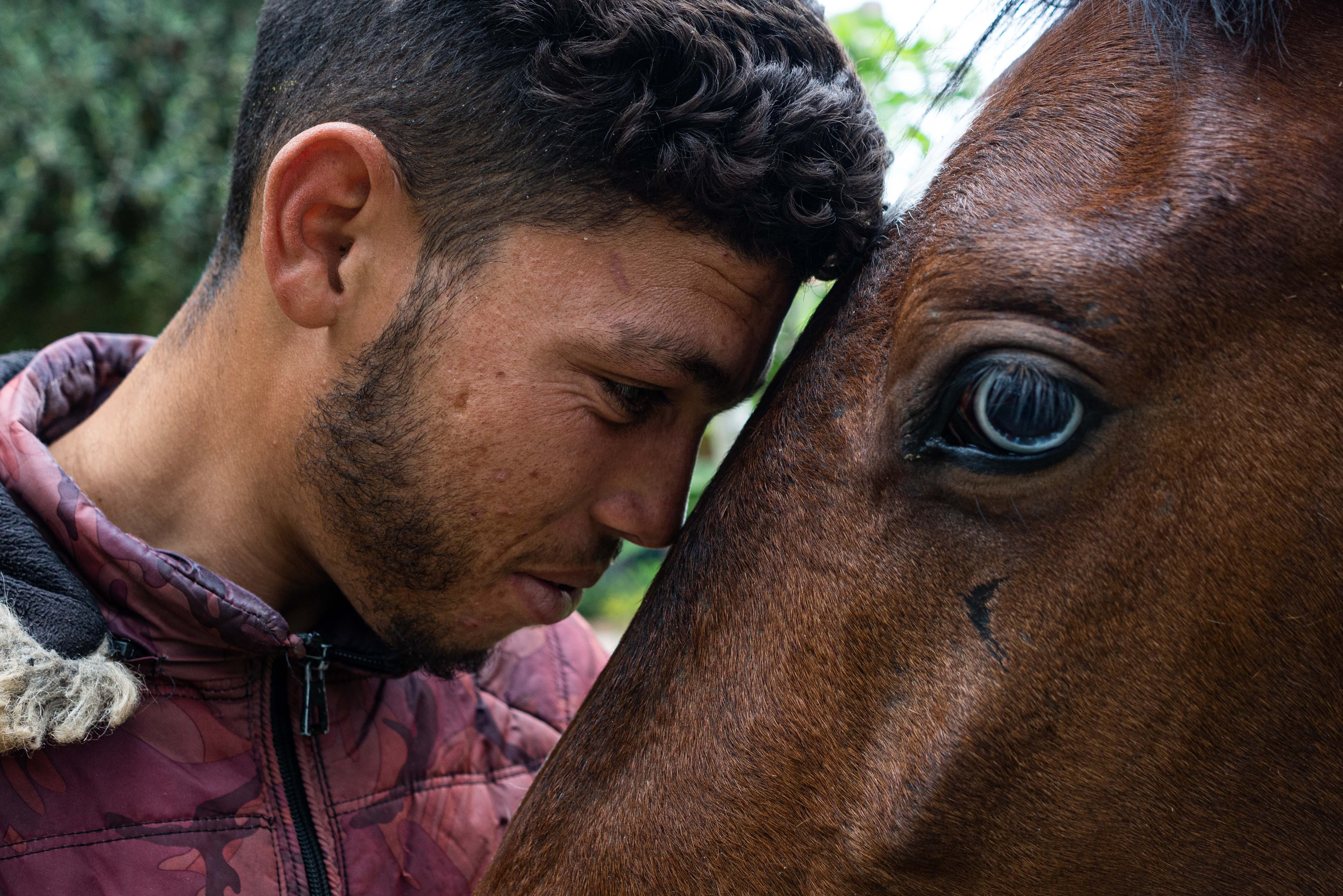 A man rests his forehead against a horse as they wait for free veterinary care provided by the only non-profit of its kind in Marrakesh, La Société Protectrice des Animaux et de la Nature (SPANA).